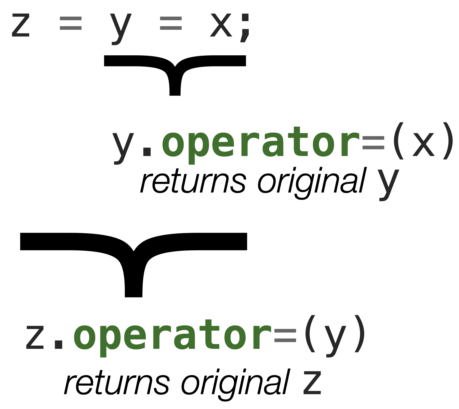 Fig. 5.3 In chained assignments like z = y = x;, the expression y = x is evaluated first, and the result, which is the original y, is then assigned to z. To enable this chaining, the assignment operator = must return a reference to the left-hand side object, or the object on which we invoked the operator= member function.#