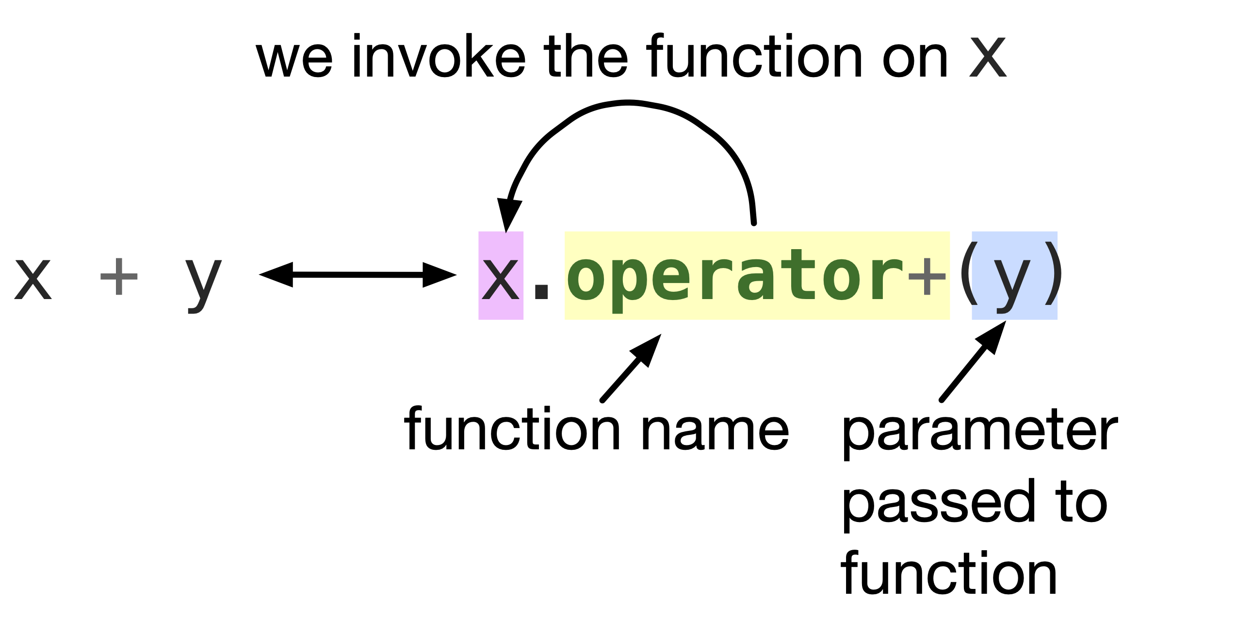 In the expression x + y;, the left-hand side of the + operator is the object of class Complex. This means we can interpret the x + y to be equivalent to x.operator+(y). The function name is operator+. It should be a member function of Complex class, since we invoke operator+ on x. The object y is passed as an argument to this member function.