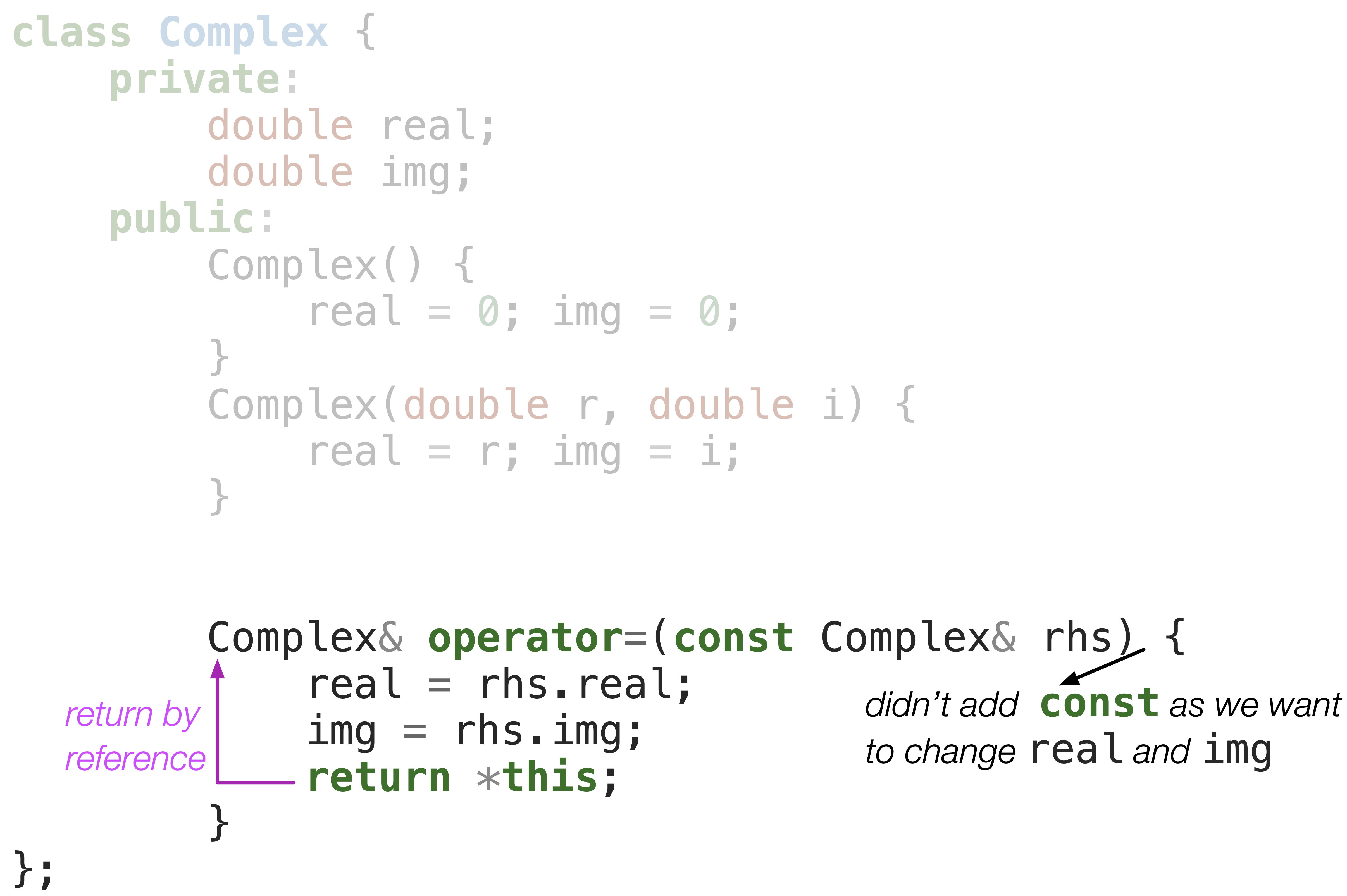 In C/C++, the assignment operator = must return something that allows for chained assignments, e.g. z = y = x;. This statement is evaluated right to left, i.e. y = x x is assigned to y, then in z = y y is assigned to z. In C/C++ standard, we should return from operator= the original left-hand side object after the assignment. Therefore, the assignment operator = must return a reference to the left-hand side object to allow for this chaining, which is of Complex class type. We add the & symbol to indicate that we are returning a reference.